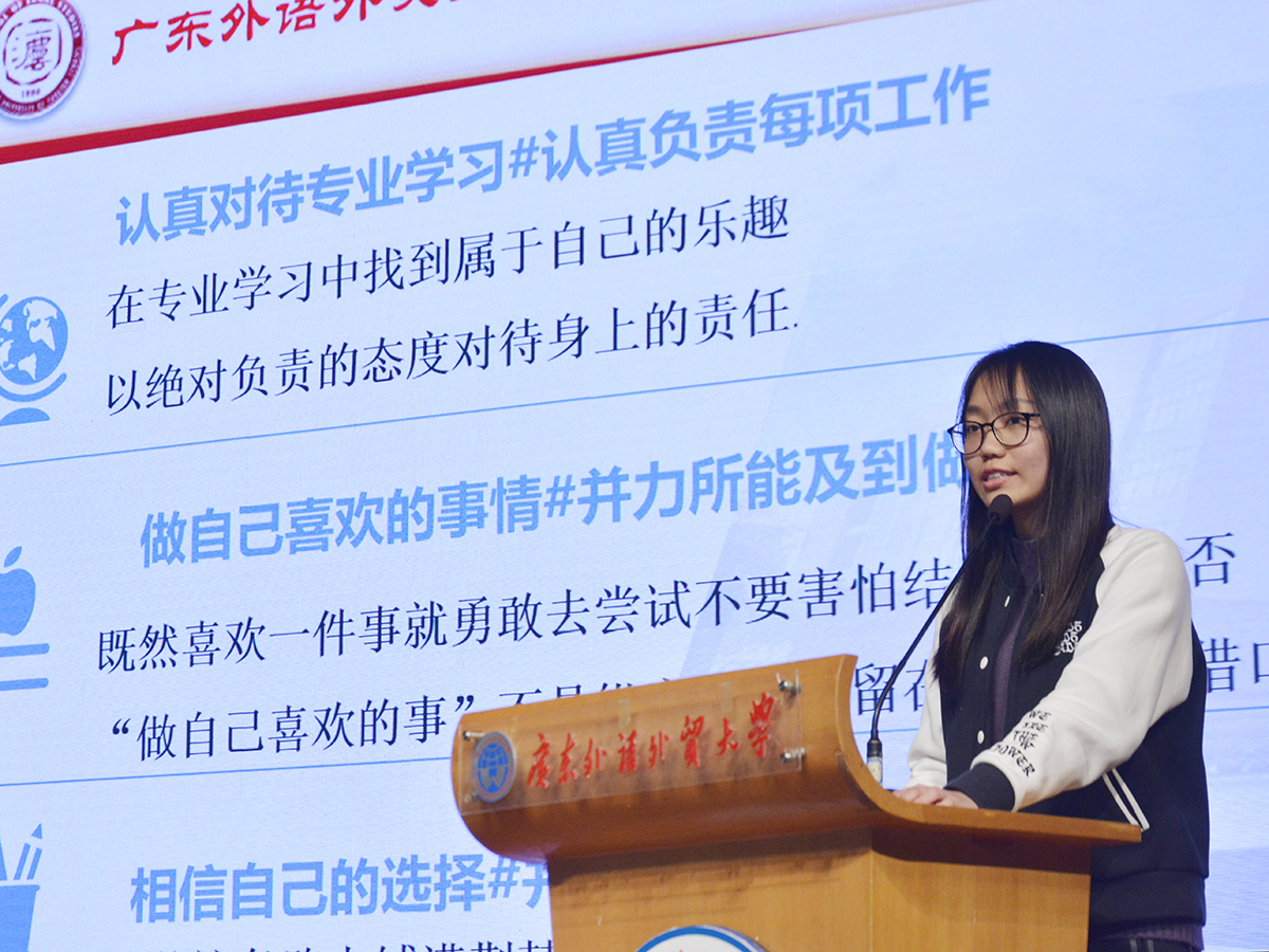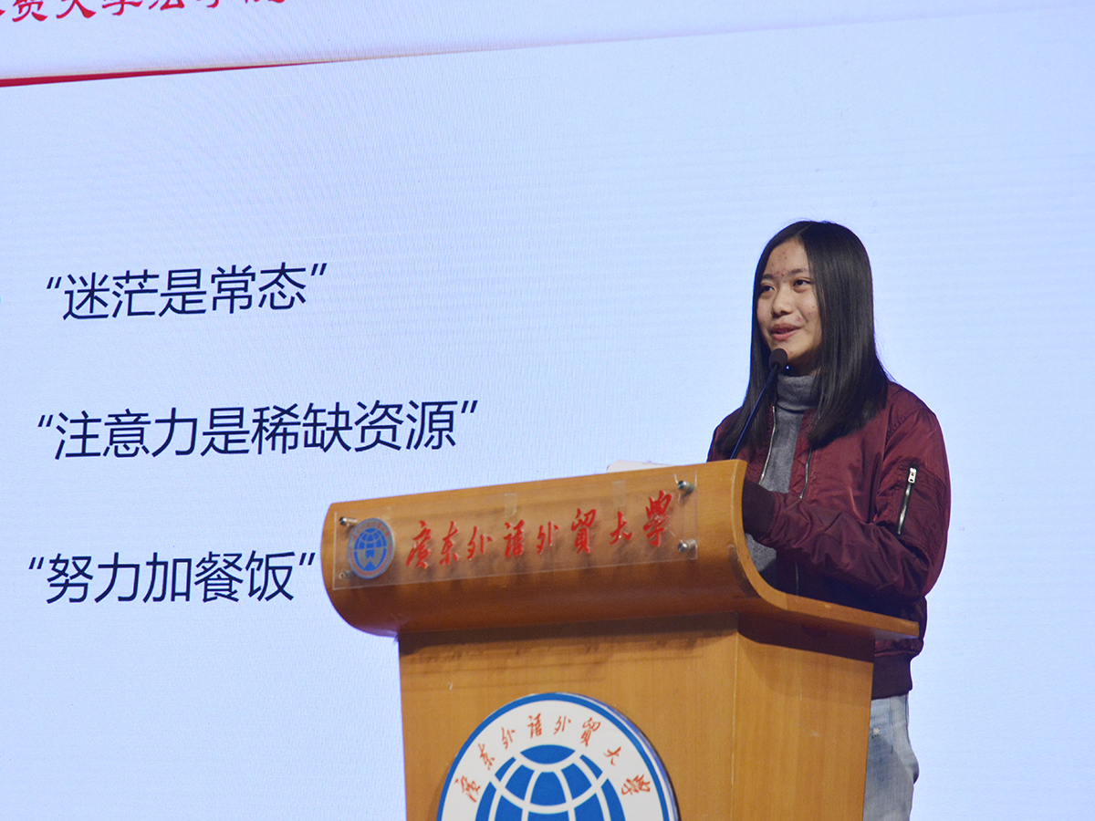 2016级国奖获得者李雨乔以新颖的角度向同学们分享了她的心路历程。第一,迷茫是常态。李雨乔告诉同学们:花时间停下来思考再蓄力前行,即使没有方向也要跑动起来;要专注,也要全力以赴。第二,注意力是稀缺资源。她认为,现在手机总是左右人的专注力,要尽量减少手机的使用,让自己更多地集中在手头的事情上。第三,努力加餐饭。李雨乔说道,路还有很长没有走,书还有很多没有看,应当努力给自己加餐饭,丰富自己的人生阅历。