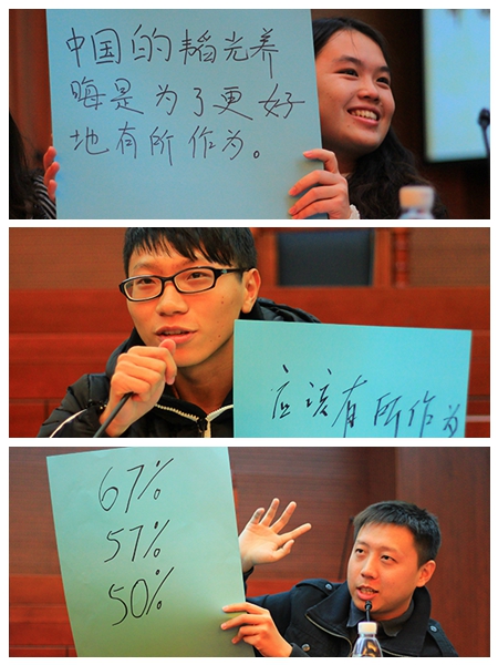 本网讯(文字:沈俊芳 何美婷 摄影:李梓濠陈昱秀 编辑:邱小艳) 对于当前国际形势中国是否应该继续坚持韬光养晦政策,法学院学子们各有各的看法。2013年12月20日晚,时事一席谈国际场在大模拟法庭举行。法学院副院长王树春、国际关系研究生陈晗尧、外交班11级在校生黎晓慧作为嘉宾出席本次谈论会。
