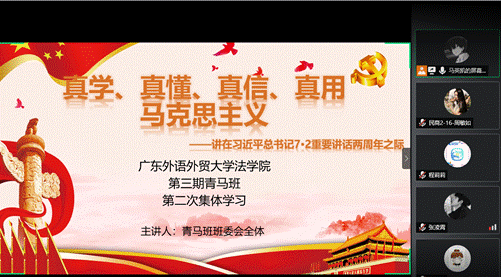 2020年7月5日下午2时,法学院第三期“青年马克思主义培养工程”培训班青年理论学习第一讲在腾讯会议进行。线上理论学习以《习近平与大学生朋友们》专题十五“真学、真懂、真信、真用马克思主义”为大主题,融合其他专题的重要内涵,将本次理论学习分为四个部分:马克思主义是什么;信仰在政党中的地位;当代青年的信仰问题以及如何将马克思主义贯彻在我们的生活中。
