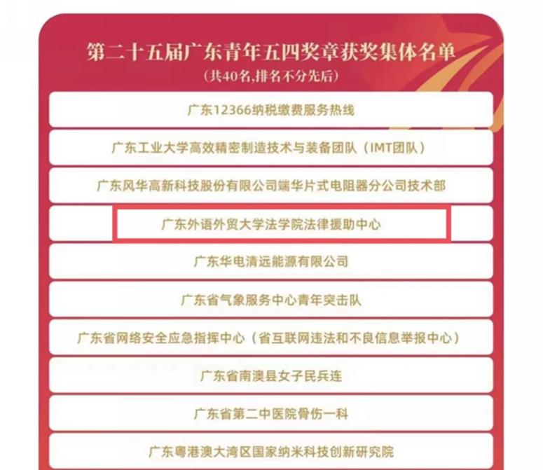 广外法学院法律援助中心获广东青年五四奖章(集体)