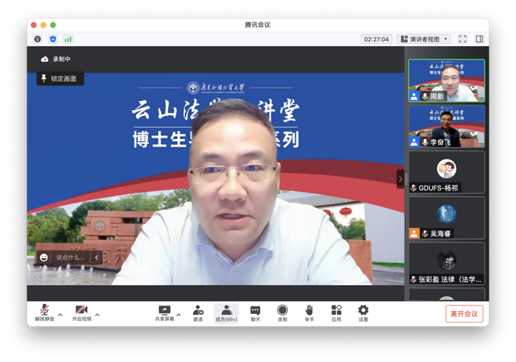 2022年11月21日晚,由广东外语外贸大学法学院主办的“云山法学大讲堂——博士生导师讲座系列”第六期通过腾讯会议于线上顺利举办。中国人民大学法学院教授、博士生导师、中国人民大学诉讼案例研究中心主任、企业合规检察研究基地主任李奋飞教授以“涉案企业合规刑诉法立法争议问题”为题做了一场精彩纷呈的讲座。本次讲座由我校法学院博士生导师周新教授主持,三百余名师生参会。讲座正式开始之前,主持人周新教授对李奋飞教授的受邀主讲、卞建林会长等专家学者莅临讲座指导以及线上参加的老师、同学们表示欢迎和感谢。
