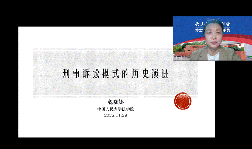 2022年11月28日晚,由广东外语外贸大学法学院主办的云山法学大讲堂暨博士生导师讲座系列第七讲“刑事诉讼模式的历史演进”通过腾讯会议线上顺利召开。本次讲座由中国人民大学法学院教授、博士生导师魏晓娜教授主讲,我校法学院博士生导师周新教授主持,300余名高校师生共同参与。