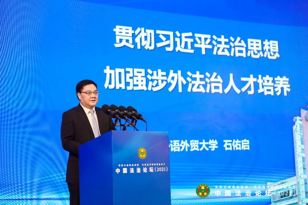 广东外语外贸大学校长石佑启教授应邀在分论坛三上围绕分论坛主题“建设法治先行示范城市的理论与实践”,发表“贯彻习近平法治思想 加强涉外法治人才培养”的主旨演讲。石佑启在演讲中说,保障和服务高水平对外开放,需要加强涉外法治专业人才培养。目前我国各高校涉外法治人才培养均是基于各自办学历史和办学基础上的探索性实践,建议教育部联合司法部等部门制定涉外法治人才培养规划,建立涉外法治人才培养国家标准,增强涉外法治人才培养的规范性、系统性。