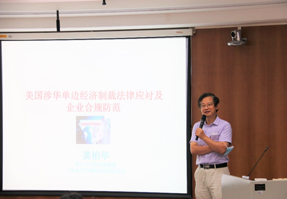 8月23日上午,复旦大学法学院国际法教授、博士生导师,复旦大学自贸区法治研究中心主任龚柏华教授为学员们讲授美国涉华单边经济制裁法律应对及企业合规防范。
