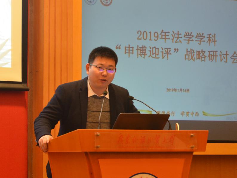 何传添副校长作题为“法学学科建设:问题与对策”的学科建设工作报告。何传添副校长首先对过去一年来广外法学学科的各位老师所付出的努力表示诚挚的感谢,同时鼓励各位老师充分利用寒假时间更加拼搏努力。他从学科与专业的关系、学科建设基本内涵、学科建设基本现状、学科建设阶段目标、学科建设思路对策等五个方面逐步展开,强调问题导向和目标导向,围绕第四轮学科评估的情况进行全面介绍和系统分析,从而针对下一轮的学科评估及博士点申报工作提出具有全局性的建设意见和建议。