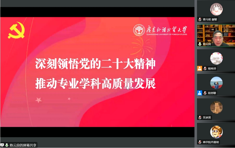 为深入学习宣传贯彻党的二十大精神,聚焦党的二十大报告中提出的新思想、新论断,12月22日晚,学校党的二十大精神宣讲团成员、法学院院长陈云良教授受商学院邀请在线宣讲党的二十大精神,除商学院师生外,我院2022级法硕党支部学生党员、法学院本科创新班学生代表参与学习。会议由商学院党委书记肖喜明主持。