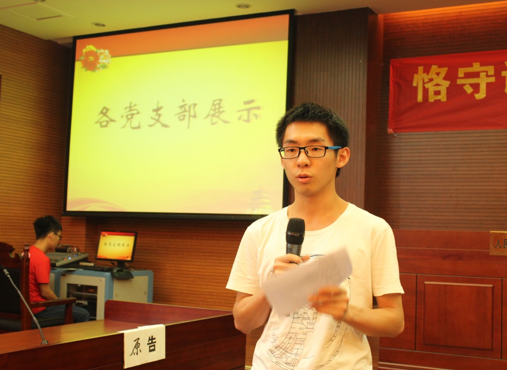 首先进行现场展示的是14级党支部。虽然是刚成立不久的党支部,但是14级的党支部成员充分运用自己的青春活力,开展义教、关爱智障儿童等的志愿服务活动,通过自身来宣传诚信的观念,使之深入青年学生的观念之中。接下来出场的12级国政外交联合党支部用风趣而不失认真的视频和现场讲说向观众展示了诚信与法治的关系以及重要性,倡导每一个公民都应该在日常生活中诚信生活。12法二法三法四联合党支部的党日活动可谓相当丰富:法院旁听引发了党支部成员对法治的热烈思考,参观农讲所和总结会议使得党支部成员意识到必须要以更高的标准要求自己,做个诚信合法的好公民。12级法一党支书简明扼要地向评委和观众展示他们参观中山纪念堂的党日活动,党支部成员齐声合唱的《红旗飘飘》更是博得全场连续不断的掌声。12级法五法六联合的党支部不仅展示了他们的党日活动内容,还合唱了一首《私奔到月球》,用歌声唱出他们呼唤构建诚信无欺的社会的内心呼唤。最后出场的13级党支部,通过讲述在下着大雨仍坚持继续党日活动的例子,加以有关诚信的诗歌朗诵,形象生动地向我们诚信与我们日常生活的紧密性。