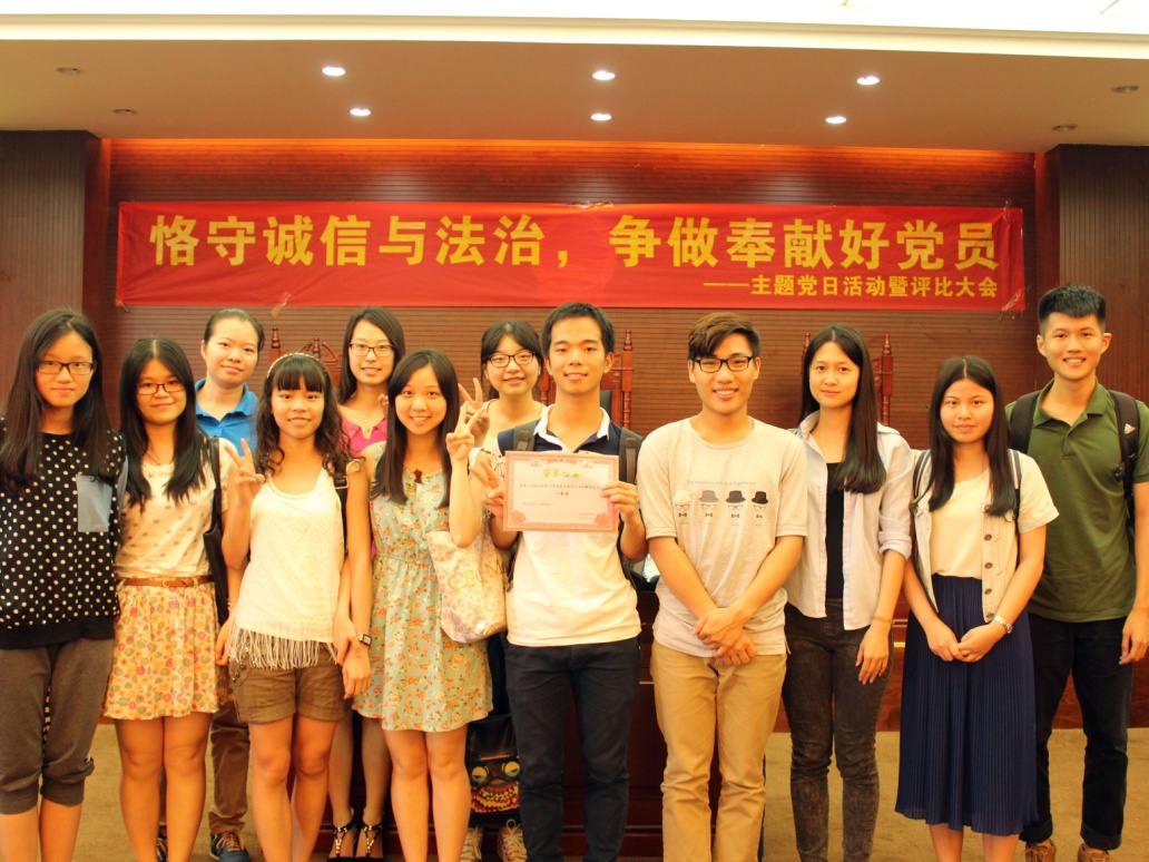 现场展示结束后,党建工作协调小组组织人事部的部长向现场观众介绍了入党的基本流程。最激动人心的时刻终于来了。经过激烈的角逐,12级法五法六联合党支部、13级党支部、12级法一党支部获得党日活动评比的三等奖;14级党支部、12级法二法三法四联合党支部获得二等奖;一等奖则花落12级国政外交联合党支部。