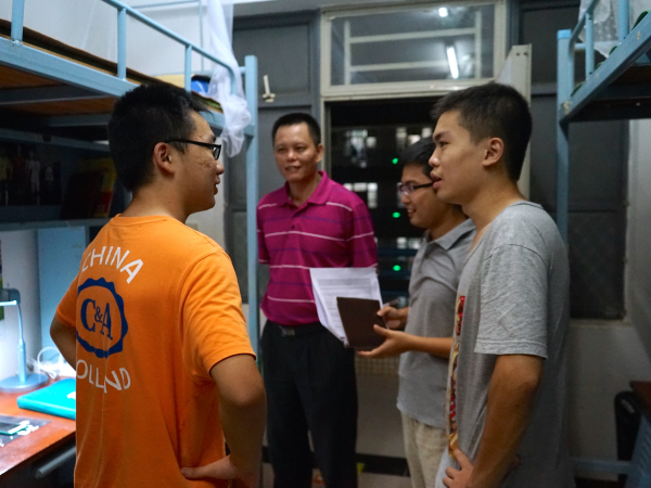 傍晚时分,新生报到工作基本完成,工作人员进行后期的物资回收和清理收场。在宿舍安顿下后,代班们在晚上组织了新生见面会,让尚不熟悉的同学们有一个介绍和交流的机会。随后,林茂辉和15级新生辅导员陈宇在主席团成员的陪伴下亲临宿舍进行视察。领导们对新生的生活用品添置问题十分关注,同时也询问了他们对住宿条件的看法。对于今天的接待工作,新生都一致表示“非常满意,代班们都很尽责。”林茂辉则说道,“希望明年你们能把这种传统传承下去,新老生相互关爱。”