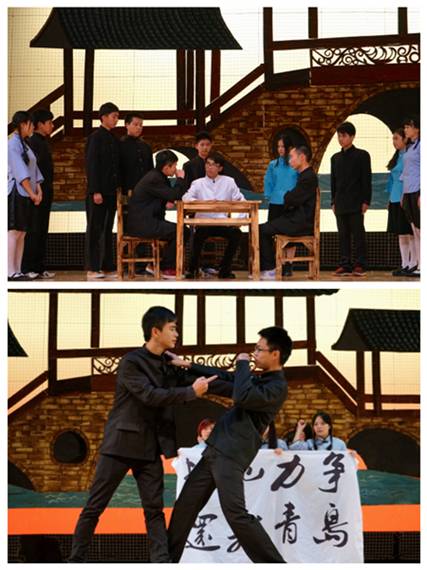 而后,13法三的话剧《破晓》带领我们回到抗日时期中华儿女团结一致,恢复中华的场景。剧中主人公从平静的乡村辗转到风云暗涌的上海再到北京。国难在头,他们众志成城、坚韧不拔,就像破晓的霞光为中国的复兴带来希望。