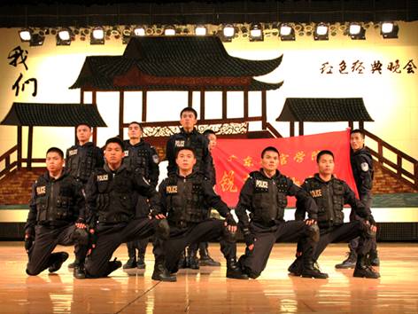 接下来出场的广东警官学院锐虎机动中队的学生,他们精彩的演出将晚会推向了一个高潮,拳拳有力,声声响亮,他们的打拳表演展示了中国男儿的雄姿。接着的对打表演,他们用有力的双臂,坚定的眼神诠释了英勇无畏,锐意进取的精神。同样精彩的还有 “卧倒”表演,正倒、侧倒甚至是翻倒。