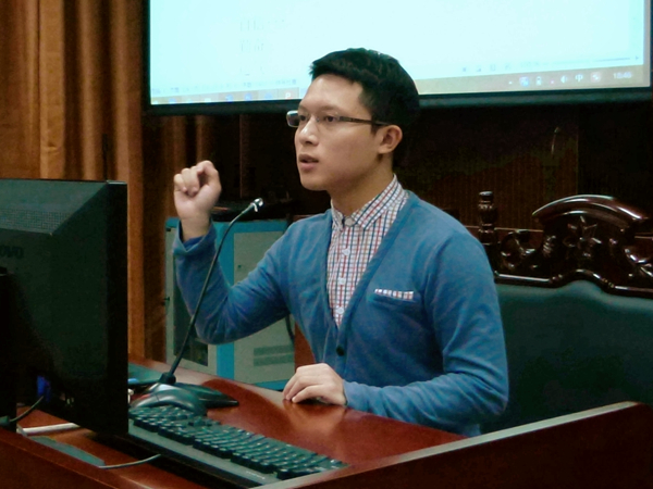 第三个为大家进行经验分享的学霸前辈是在2014年司法考试中取得446高分成绩的黄彦龙。他首先提出第一个论点:司考并没有那么可怕。随即附加了不同科目类型的真题以解释科目考试的内容和他在分析解体时的思路,并且分科目介绍了他在复习时使用的资料和推荐的老师。第二,他提出“司考没那么容易”。在这个部分里他分享了自己的三轮复习经历,强调了笔记的好处即随时可供翻阅等。针对学生普遍忽视卷四练习的情况,他还特别强调一定不能忽视这一内容的复习,而且还要做好时间分配,他提醒同学们可以使用共犯平台搭建和分别定罪量刑的方法来进行卷四内容的学习。最后,他提出并总结了在准备司考过程中最重要的一点:要心中充满正义。