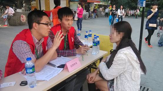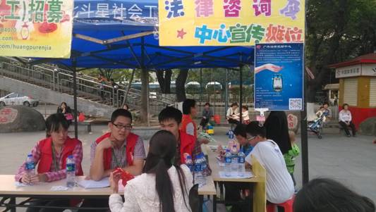 本网讯(文字:吴菁菁 摄影:吴菁菁) 2014年11月22日下午,黄埔人家服务中心在黄埔区街心公园开展“家点温馨,远离暴力”的反家暴社区活动。广东外语外贸大学法律援助中心(以下简称“广外法援”)志愿者郑志铠、杨泓远、董佩珊、吴菁菁应邀到现场协助活动的开展,为社区居民提供婚姻法相关的普法咨询服务。