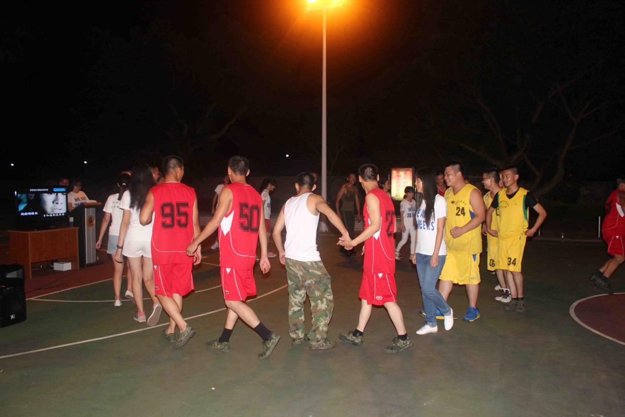 篮球比赛后的联谊晚会更是掀起一阵又一阵的高潮。武警官兵们及其部分家属都到场了,武警官兵们还热心周到地为到场人员准备了西瓜和饮料。第一个游戏是“五毛一块”。游戏规则是:一个男生代表一块,一个女生代表五毛,当主持人说几块几,参与游戏者就应该迅速得找人来组成这个数字。游戏开始,参与游戏的武警官兵和凝光队员就随着音乐手拉手地转圈。突然间,主持人大喊“三块五!”,刚刚的大圈迅速被打散,现场掀起了一场“腥风血雨”的抢人大战,欢笑声此起彼伏。在游戏环节过后,武警官兵还与凝光队员们进行了K歌,从流行歌曲《小苹果》到军歌《军中绿花》,现场气氛高涨。