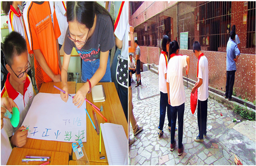 课程的开始,老师让同学自由分组。六个组的同学先自由讨论,讨论的主题是:如何减少校园乱扔垃圾的现象。同学们在讨论中各抒己见,纷纷对此发表自己的观点。一轮讨论后,同学们带上笔记本和垃圾袋,在老师和助教的陪同下走出课室,边记录校园内垃圾多集中的地方,边随手把垃圾捡起。回到课室后,同学们先对刚才考察的现象进行汇总,最后出谋划策想出解决方案,小组合作制作本组的手抄报并设计标语。