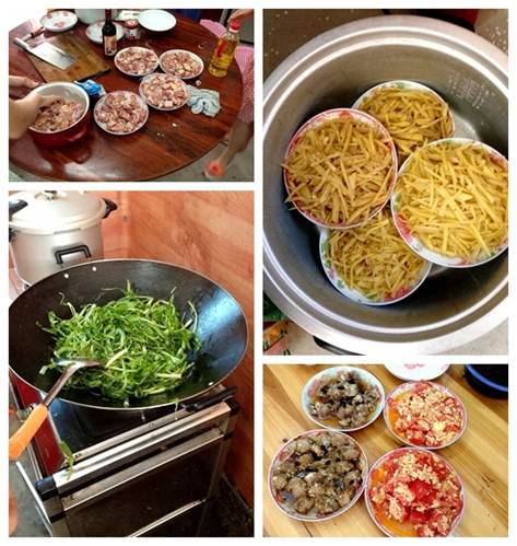 厨房里有人洗菜,有人切菜,有人配菜,有人炒菜,他们分工合作,井然有序;烹调的样式也很丰富:蒸,焖,煎,煮,炒样样皆有。经过3个小时的努力,他们成功地烹制出了美味的番茄炒蛋、豆豉蒸排骨、煎鸡翅、醋溜土豆丝、炒通菜和紫菜蛋花汤,看着这些成果,队员们都露出了欣慰笑容。