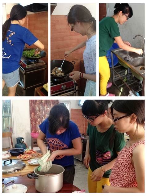 面对这烹煮第一顿饭的艰巨任务,在一开始,负责做饭的同学们显得有点手足无措,不少人担心做不成一顿饭。所以为了能更顺利地完成这个任务,后勤组的组员们在前一天就为此开会进行研讨,力求保证队友们在辛苦了一天后能吃到较可口的饭菜。于是,经过不断的讨论,征求意见和修改策划,终于在前一天的晚上做出了一份完善的策划,包括制定菜谱,安排买菜人员,做饭人员,洗碗人员以及每一项工作的负责人等。于是这一天,飞young梦使团的后勤组成员们集体分工,他们先在早上买了食材,然后在中午对部分食材进行腌制加工,最后在下午对食材进行烹煮,整个做饭的流程顺畅有序,也分工明确。