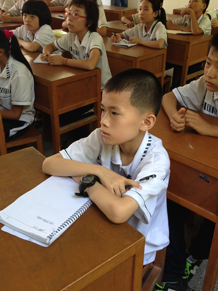 作为国际政治专业的学生,为了在义教教学中体现出专业特色,特别开设时事课这一特色课程。其目的是为了让当地的小学生多了解国内外时事,开拓个人视野,培养爱国时事情怀。当天10点许,时事课主教庄晓琳准时出现在1班的课室。她首先利用几张外国元首的照片引入课程的主题,并着重介绍了美、英、日、法、德的国家元首和政府首脑,为同学们普及了最基本的时事知识。随后,她开始上半年的国内外时事——从“神舟十号”升天到上海建立自贸区,从PM2.5到东海防空识别区,从习近平出访各国到安倍晋三参拜“靖国神社”……其时事的覆盖面广而全,在介绍的过程中还普及了一些国际政治方面的基本知识,如“金砖五国”的由来和组成。最后以一个妙趣横生的时事常识小游戏结束了整节课。
