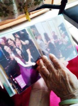 志愿者与老人亲切交谈、老人向志愿者展示相册
