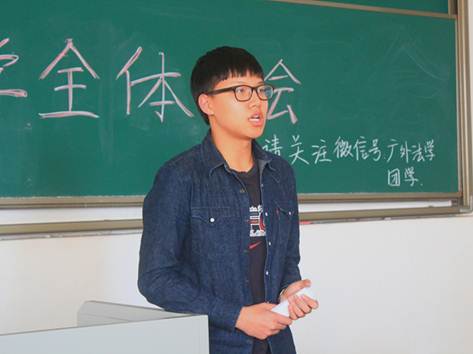 大会最后,法学院团委学生会主席蓝涛发表了简短讲话,一方面介绍了法学院团学的公共微信号:广外法学团学,另一方面劝告所有团学人好好享受待在团学的剩余时光,认真思考未来的选择:是留任,还是离开?
