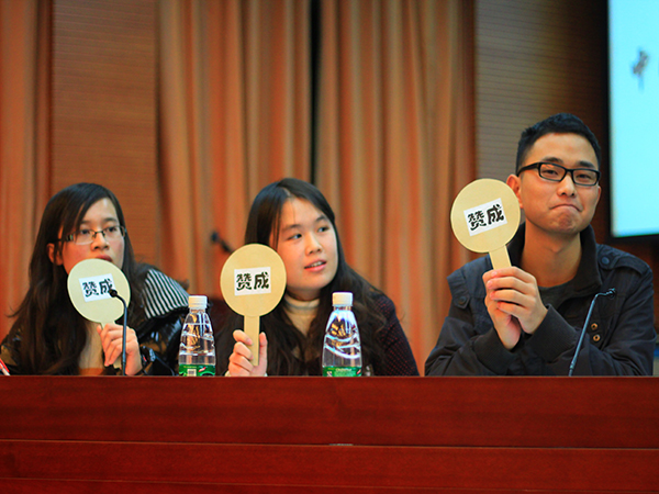 本网讯(文字:沈俊芳 何美婷 摄影:李梓濠陈昱秀 编辑:邱小艳) 对于当前国际形势中国是否应该继续坚持韬光养晦政策,法学院学子们各有各的看法。2013年12月20日晚,时事一席谈国际场在大模拟法庭举行。法学院副院长王树春、国际关系研究生陈晗尧、外交班11级在校生黎晓慧作为嘉宾出席本次谈论会。