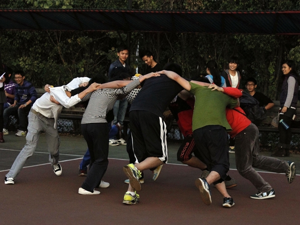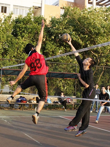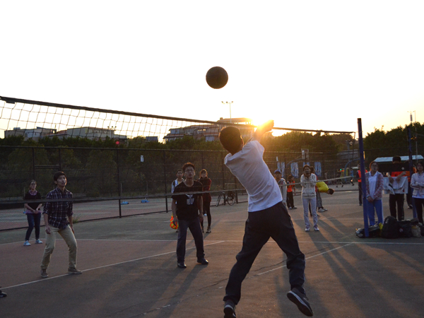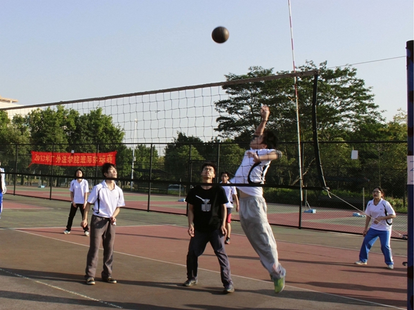 下午3点,法学院VS英语教育学院的比赛在6号场上进行。运动员们早早到达赛场,做热身运动、商量战略。比赛开始,气氛紧张起来。比赛前期,英教学院紧追法学院。法学院张梓斌的连连扣球让英教学院略感吃力,同时,法学院罗家樑的发球技巧更是让人叫绝,球要么刚过网,要么压线飞出去,对方很少能接到球。上场的大多数是今年的新球员,都能发挥较好的水平。比赛进行不到10分钟,比分优势渐趋明显了,在各位队员的紧密配合和灵巧走位下,法学院两个小半场都取得胜利,最终战胜英教学院。