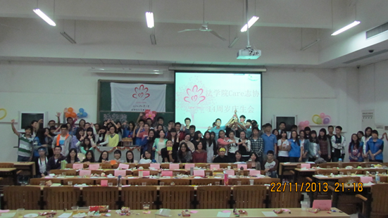 本网讯 “爱心仍在继续,我们还在路上”,转眼间法学院Care志愿者协会已走过数十载年华。2013年11月22日晚七点至九点三十分法学院Care志愿者协会于教学楼C308举办了十四年庆生会。