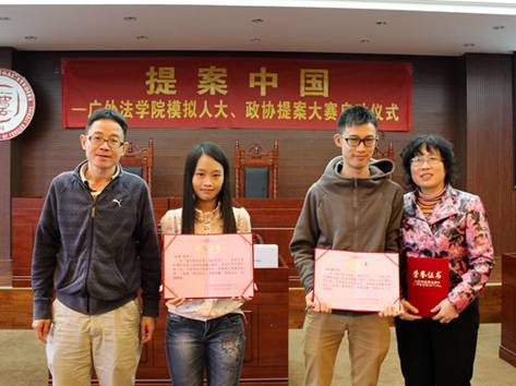 第八届“与法同行”系列活动之提案中国——广外法学院模拟人大、政协提案大赛面向广外法学院学生(包括“4+0”双学位、学历班,鼓励在以法学院学生为主的前提下,跨专业组队参赛),以小组的形式参赛。每队人数不超过8人。本次提案大赛借鉴2013年举办的“提案中国——全国大学生模拟政协提案大赛”的宝贵经验,初赛形式采取队伍撰写开题报告的形式,选出优秀队伍进入复赛。复赛阶段队伍通过调研撰写调研报告并上交,进入决赛阶段队伍通过现场展示,由校内外人大代表、政协委员、专业老师及校友担任决赛(2014年3月中旬)的评委,评出本次比赛获一、二、三等奖的队伍。