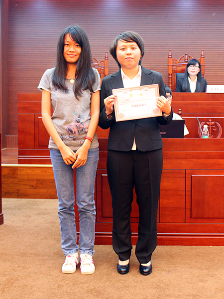 在冠军争夺战中,来自反方的马淑娟获得全场最佳辩手的称号。最后,主席团嘉宾为最佳辩手、全场最佳辩手、最佳组织奖和冠亚季军颁奖,至此,广东外语外贸大学2013年法学院新生杯辩论赛圆满结束。