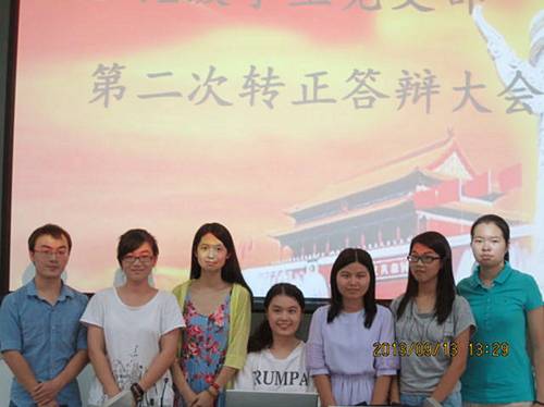 接着7名预备党员依次进行转正答辩。答辩过程包括个人陈述、现场答辩、民主评议三个环节。在陈述环节,答辩者从预备期间的思想、学习、工作和参加组织生活等方面进行总结汇报,找出并分析自己的不足,努力在各方面完善自己。唐嘉慧同学在考察期期间,虽然身兼多职,却做到学习工作两不误,仍能保持成绩接近于4.0的好成绩,充分发挥了党员的先进性和模范性。而热心于公益的曹欣欣同学则说,“这一年以来让我感触最深的是加入自强社,通过参加‘爱心包裹’劝募等活动,深刻体会到用自己的力量去帮助别人的幸福感。其实,在现实生活中党员也应该如此,尽自己力量帮助别人......。”而在提问环节,党支部答辩委员会成员们围绕党的基本理论、创新组织生活等内容进行激烈提问,但转正答辩的绝大部分预备党员能沉着应对并流畅地回答了各个提问,而且积极分享了自己对时事热点的看法。随后即是现场评议环节,答辩委员会成员们根据答辩人的个人陈述和问题的回答情况,进行民主讨论与表决,最后经答辩委员会表决决定:唐嘉慧、袁泳欣、李嘉欣、李冠玲、曹欣欣、吴子滢、何旭七位预备党员光荣地转为正式党员。