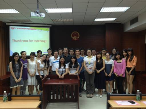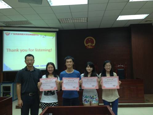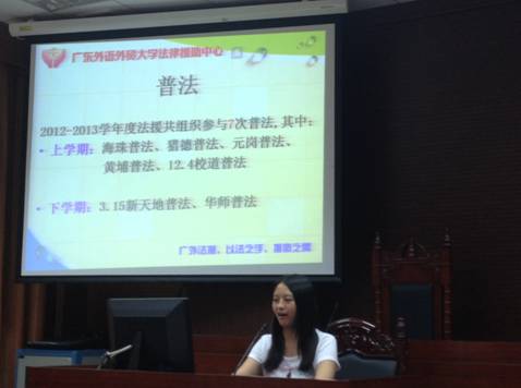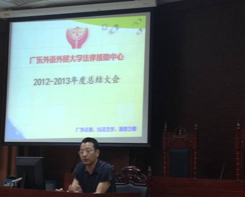 本网讯(文字:陈立锐;摄影:刘晓纯 编辑:吴惠敏) 6月26日晚上9点40分,广东外语外贸大学法律援助中心(以下简称“法援”)在第二模拟法庭召开2012-2013年度工作总结大会。出席本次会议的有:广东外语外贸大学法学院党委副书记卢海清,法援指导老师叶昌富,法援2012届主管,法援2013届新主管,法援2012届业务员及助理。会议由五个部分组成,分别对法援一年以来的工作进行总结和对法援的未来作成展望,并在最后为法援成员颁发证书,以示鼓励。大会在肯定法援一年以来取得的优异成绩的同时,也指出其中的不足之处,并希望新一任的法援领导班子继续发挥优良传统,大胆创新,继续带领法援取得更加优异的成绩。