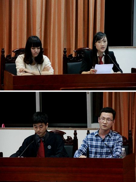 紧接着进入模拟法庭阶段。书记员宣布法庭纪律后,正式开庭。开场节目围绕 “离婚夫妻间的不当得利”的法律问题进行展示,由研究生12级民商法专业同学参演。