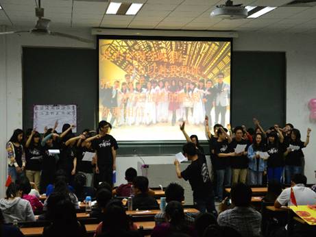 本网讯(文字:王灏 摄影:张恺茵) 2013年4月1日晚,法学院2012-2013学年度11级红旗团支部评比活动在教学楼G207展开。为了加强各部凝聚力,推动团支部创先争优工作不断深入,增进各部之间的工作配合,11级各班以班级展示的形式参加此次评选活动。此次评分细则包括升旗仪式、支部建设、实践活动、团支书大会、辅导员评分、各支部互评和现场展示。