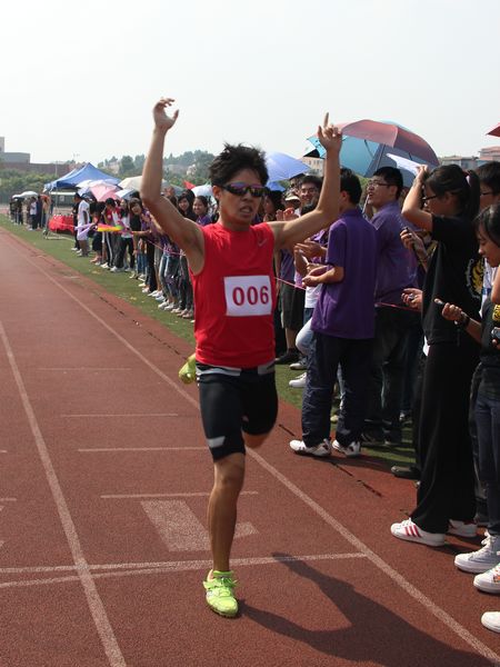 随着“砰”的一声枪响,比赛开始了,赛道上的运动健儿们像离弦的箭一样冲向终点。经过紧张而激烈的竞争,最后,来自11级法五的张烽夺得男子100米决赛的冠军。