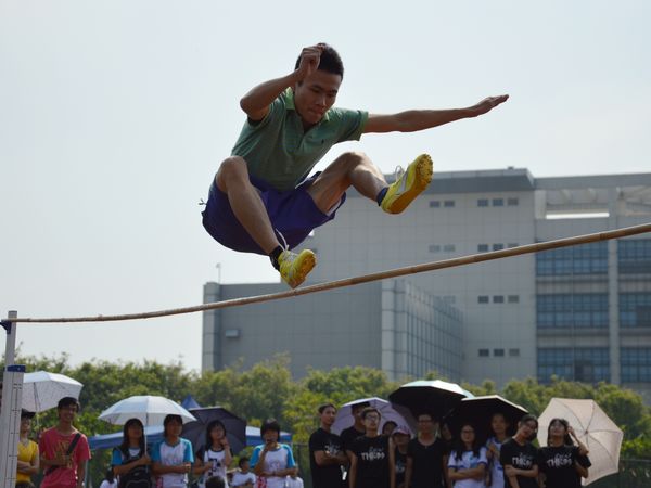 跳高可谓本次院运会挑战不断,精彩纷呈的一个项目。男子组首先进行比赛,竞争激烈。经过层层较量决出胜负后,来自10外交的冠军选手周建烨不断突破自我,最终以1.70m的成功一跳赢得观众的掌声和欢呼,也为男子组的比赛画上圆满句点。据采访,周建烨曾在前两届院运会跳高比赛中分别荣获三等奖和一等奖,本次参赛算是稳操胜券。相对男子组而言,女子组比赛气氛较为缓和,但是最终较量依旧扣人心弦。对决在11、12级法五的两位选手中展开,最终12级甄智贤技高一筹,以其背越式跳法赢得本场冠军,并在不断尝试中取得1.40米的好成绩,让人感叹后生可畏。