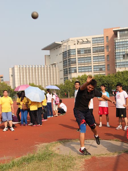 下午,人工草坪田径场上各项赛事正如火如荼地进行着。在铅球比赛开始前,参赛的选手早早地来到比赛场地进行热身。14点30分,男子铅球比赛正式拉开序幕,第一个出场的是来自10国政的邹子祺,只见他一托一推,铅球飞出一道完美的弧线。而随后登场的各位选手也战意高昂,当去年的校运会男子铅球冠军郭正阳出场时,他微笑示意,信心十足地背对投掷方向,躯干和肩带向左转,上体前倾,奋力推出铅球。标准的动作、熟练的技巧、十分的信心,郭正阳也借此一投锁定冠军。