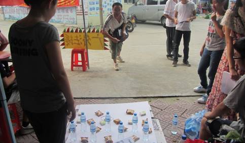 下午三点半,本次普法活动正式开始。法援工作人员有序地分成四组,开展这次普法活动。第一组带着传单深入到穗石村的各家商铺进行宣传并了解当地相关情况,第二组在现场进行套圈圈活动吸引村民的到来,增加人气,第三组负责指导村民进行有奖问答活动,第四组为他们提供法律知识解答和相关法律服务。现场还摆放着法援志愿者精心制作的案例展板,展板内容是一些与村民息息相关的案例,例如婚姻法、劳动法的案例,吸引了很多村民的注意。