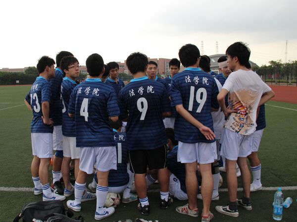 随后,对手采取了远射以及直塞身后的战术,对法学院的禁区造成了很大的威胁,但我院足球队门将车伟辉奋力扑救,化解了多次险情,缓解了对方的进攻气势。比赛一直处于势均力敌的对峙状态,法学院适时地采用长传及前场配合的方式以击垮对方的后防线,虽未能成功进球得分,但仍扭转了被对手压制的不利形势。然而在上半场的补时阶段,对手从边路吊球入我队禁区,前场一名前锋头球攻门,最终先取得一分,我院暂时落后。