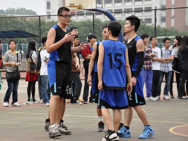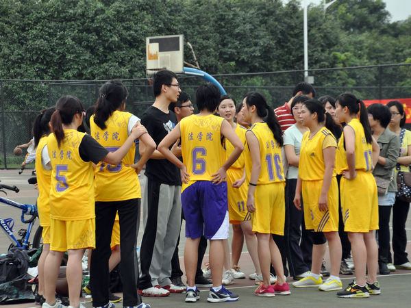 法学院男子篮球队首场比赛对阵政管学院。开赛的争球环节,法学院夺得先机,率先控球开始进攻。第一次暂停休息时,我队已经以5:1暂时领先。时间分分秒秒过去,赛场开始硝烟弥漫,我队直到第二节尾声都一直保持领先优势,并在第二节仅剩十秒时投进一球,将上半场比分定格在16:6。