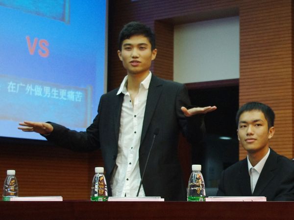 比赛采取六轮制,并采用专业的计时规则。开篇立论环节,正方率先强调,在广外女生更痛苦,女儿要当男儿使,男女比例1:7,女生痛苦乘以七。反方也毫不示弱,由工作谈到学习,学习再到情感,面面俱到地表达了广外男儿的痛苦,并通过队员的模仿,进一步地将广外男儿之痛展现得淋漓尽致,博得现场掌声连连,最后反方用一句“人生最痛苦不是没有选择,而是选择太多” 幽默而有力地表达了自己的观点。