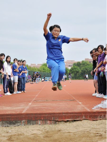 俗话说:初生牛犊不怕虎。在女子跳远初赛中,来自11法六的劳丽君在第一跳便跳出了4米33的最高成绩,以其不可阻挡的气势勇夺冠军。10法四的朱家慧和11外交的胡玉萍分别以4米10和3米90的成绩位列第二、第三名。