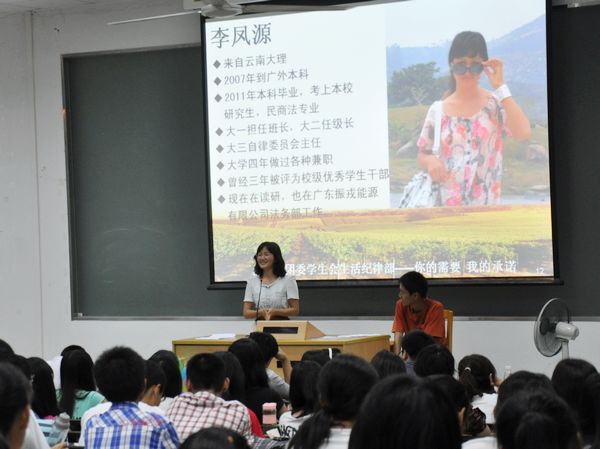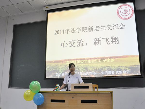 本网讯(实习文字:张泽宇 蔡力为 实习摄影:黄安琪 曾颖琛) 9月29日晚,由法学院团委学生会主办,法学院团委学生会生活纪律部协办的2011年法学院新老生交流会在教学楼G207举行。11级新生辅导员郭嫄,学生嘉宾易珺、李凤源、丘钰萱、高可闻、卢敏娜出席了本次会议。