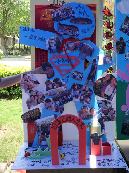 风格独特的展示形式故然能使效果更佳,但更重要的是内容充实。本届展示适逢建党90周年,各班的团日活动成果展示也体现大学生奉献青春,紧跟党走的情怀,10法四在现场播放起了经典红歌,为本次活动增色不少。