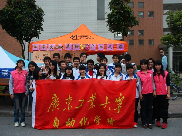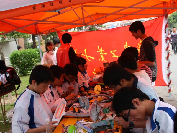 活动中,广外法学院CARE志协的志愿者主要负责宣传工作,广工自动化学院学生会实践部的志愿者们则安静地坐在帐篷内: 女生们负责登记故障电器主人的相关信息和通知已修好电器和电器无法维修好的主人前来领回电器,男生们则埋头修理同学们拿过来的故障电器,十分专注。期间除了有师生拿着台灯、风筒、电饭煲等故障电器来维修外,还有不少同学前来质询关于日常电器的使用和维护的问题,广工的志愿者们都一一耐心地回答。