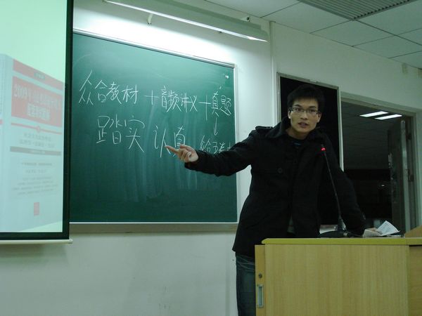 首先与观众交流经验的是陈挚,他先以一条公式:实力+淡定+运气=成功的保证拉开交流会的帷幕,他强调司考准备过程中心态的重要性,要把紧张化为动力,巧妙利用压力这一双刃剑,从而为成功作出保证。