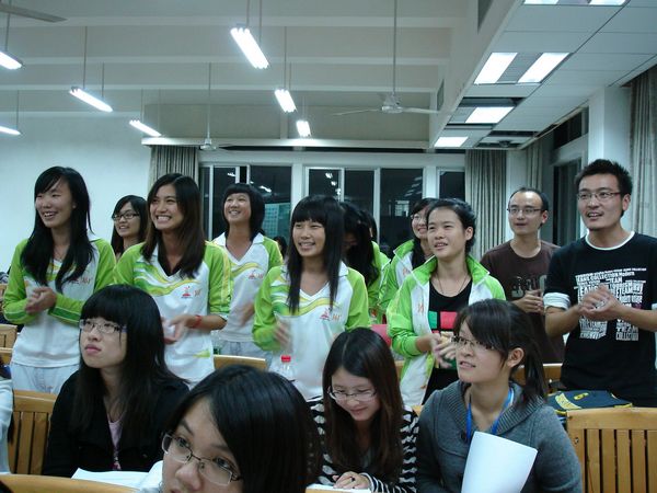 对于经历过亚运志愿者工作的09国政和外交来说,有着更多与亚运的故事。国政向大家讲述了“小白菜”生涯中的酸甜苦辣,分享了他们精彩的故事,并表示将在接下来的残运会中继续“志愿着,并快乐着”。外交班代表们身着志愿者工作服,分享亚运志愿心得;同时,他们还带来班风学风建设方面的经验,如建立“班级小金库”、专四模考制度,自主营造学习小语种氛围等。