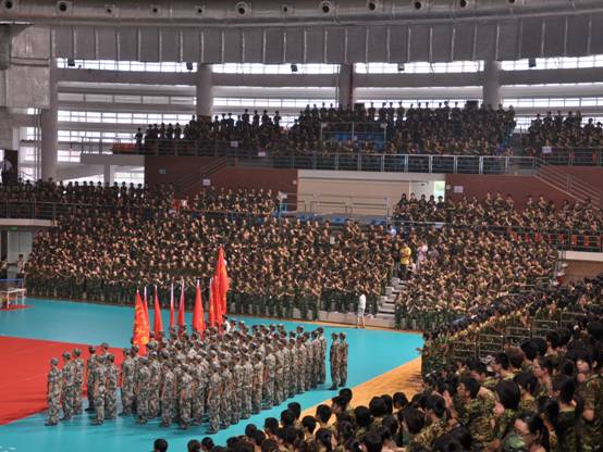 本网讯 9月6日下午,军训授旗仪式在南校区体育馆内举行。在热烈的掌声中,负责本次军训的教官整齐有序地进入会场。随后,军训政委为军训旅授旗。当鲜红的旗帜交到营长和各连长的手中时,本届新生的军训之旅拉开了帷幕。