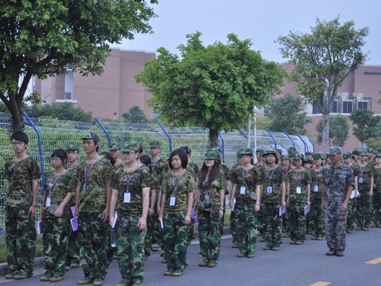 精彩的表演告一段落,紧接着是教官和新生的第一次近距离接触。法学院的新生以班为单位,列队于体育馆外的校道上等待教官的到来。看到教官黝黑的脸庞,新生们既感到兴奋又带点担心。所谓新官上任三把火,一个教官刚来到所属班便要求新生们带上军帽,另外一个教官则直接来一个“对齐”……军训伊始,这些教官们便让新生感受到军训的严格。整好队伍后,法学院的新生“大军”便前往运动场对以后军训的场地进行踩点。