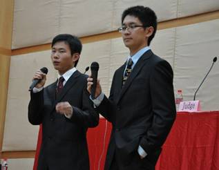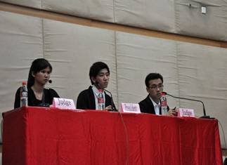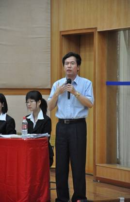 本网讯(文字:刘曲芳 摄影:张楚)2010年5月26日晚上7点,法学院首届全英国际法模拟法庭决赛在图书馆报告厅拉开帷幕,2007级的许飞鹏和方彦霖主持本次活动。受邀出席的嘉宾有教务处尚敏锐副处长,法学院蔡镇顺院长、卢海清副书记、杨斐教授,以及修文辉、惠耕田、梁晨、郭嫄四位老师。