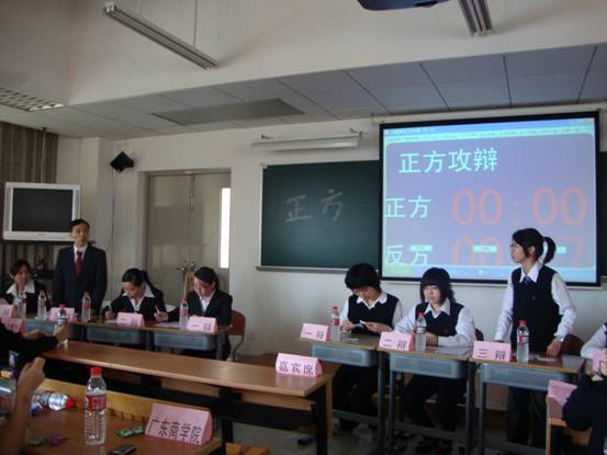 本网讯(文字记者:吴爱弟 摄影记者:曾静婵)2010年4月11日下午,中国移动杯第五届广东省高校法学辩论联赛精彩再续,广外法学院辩论队迎战广商法学院辩论队。担任评委的有华农的邱章芯、广大的潘毅、广工的何婷、华师的曲阳及中大的陈拙。华工辩论队、广商辩论队、广外管院辩论队的部分队员作为嘉宾出席了本场比赛。